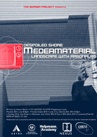 Using an innovative theatrical style coupled with multilayered sound and video, The Border Project creates a fragmented portrait of Medea hallucinated by lone TV viewers hypnotised with the images channeled into their living rooms. By overlaying and colliding images from Film Noir, Soap Operas, Basketball and the Azaria Chamberlain case, Medeamaterial dissects this ancient story of betrayal, desire and revenge amongst feedback and flickering televisions.